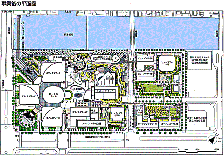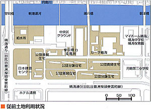 1)従前の公団晴海団地(分譲及び賃貸)の建て替えを、市街地再開発事業において実施。従前居住者のスムーズな戻り入居のために2段階施行を採用。