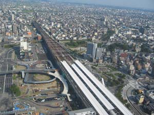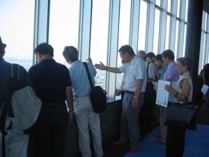 スカイラウンジにて 無料展望スペース。 一部をレストランとして賃貸し、エレベーターなどの維持管理費を捻出している。 名古屋の夜景が浮かびあがって見えるのが自慢。 遠くの山並みの風景も見所。 |