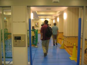高齢者向け優良賃貸住宅用の3階の入り口 3階にはLSAの部屋があり、かならずその前を通る。 分譲住宅は5階で乗り換え。セキュリティを考え、1階から直通アクセスできないようになっている。 |
